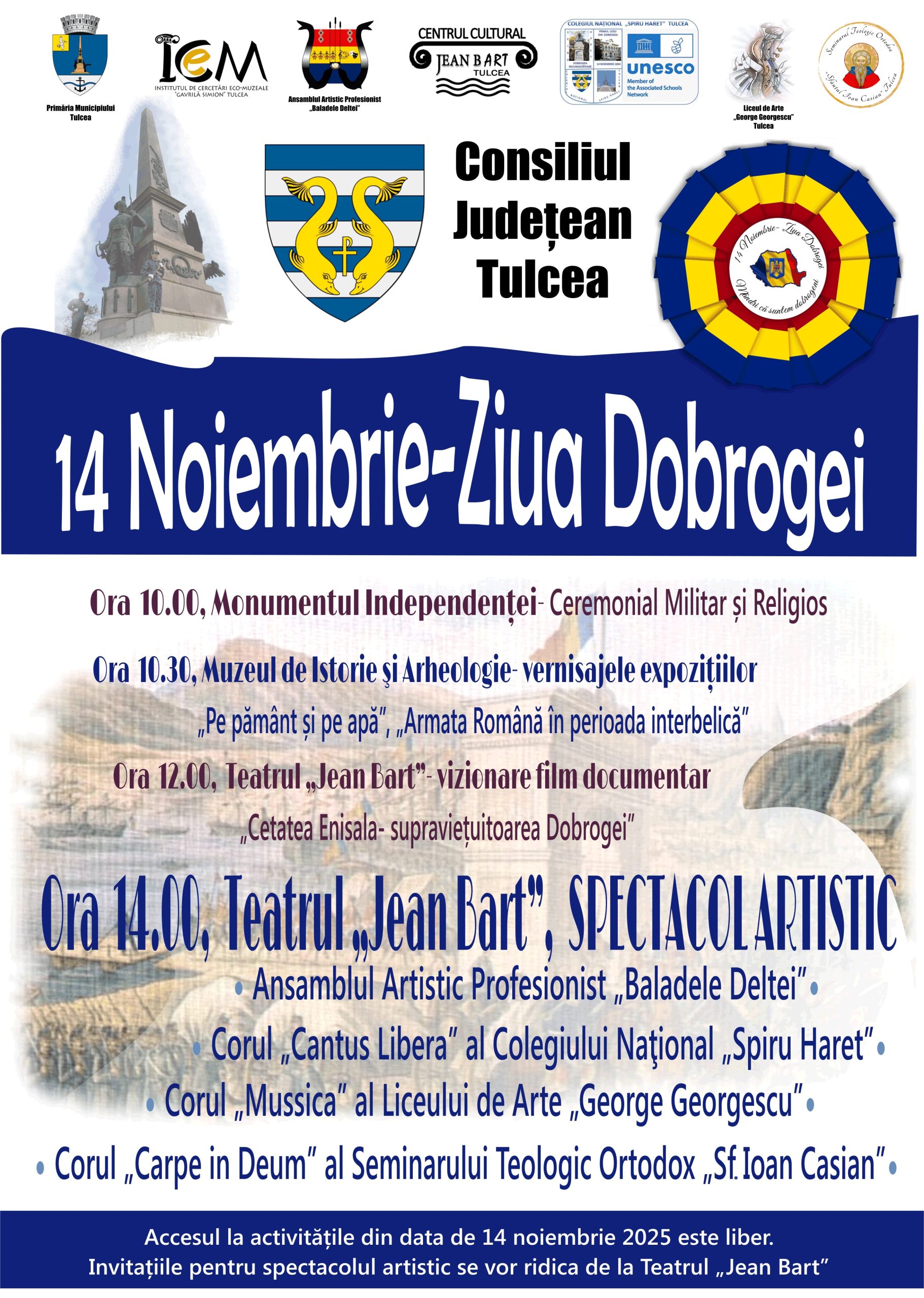Vineri, 14 noiembrie 2025, Consiliul Județean Tulcea vă invită la evenimentele organizate pentru a marca Ziua Dobrogei.