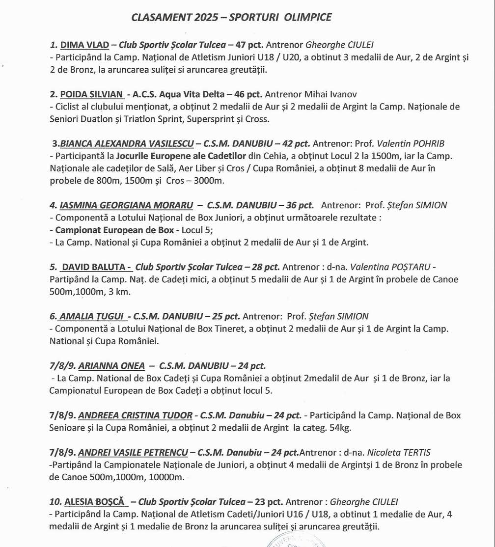 Direcția Județeană pentru Tineret și Sport Tulcea a finalizat clasamentul sportivilor tulceni pentru anul 2025, în urma centralizării rezultatelor transmise de cluburile sportive din municipiu. Ierarhia a fost realizată pe baza grilei de punctaj a Agenției Naționale pentru Sport, iar în clasament au fost incluși doar sportivii cu vârsta de peste 14 ani.