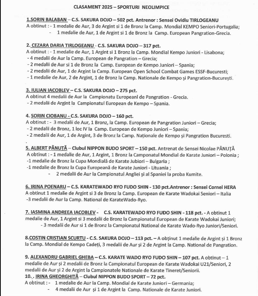 Categoria sporturilor neolimpice este condusă detașat de Sorin Balaban (C.S. Sakura Dojo), care a acumulat 502 puncte, grație numeroaselor medalii obținute la Campionatele Mondiale și Europene de Kempo și Pangration.